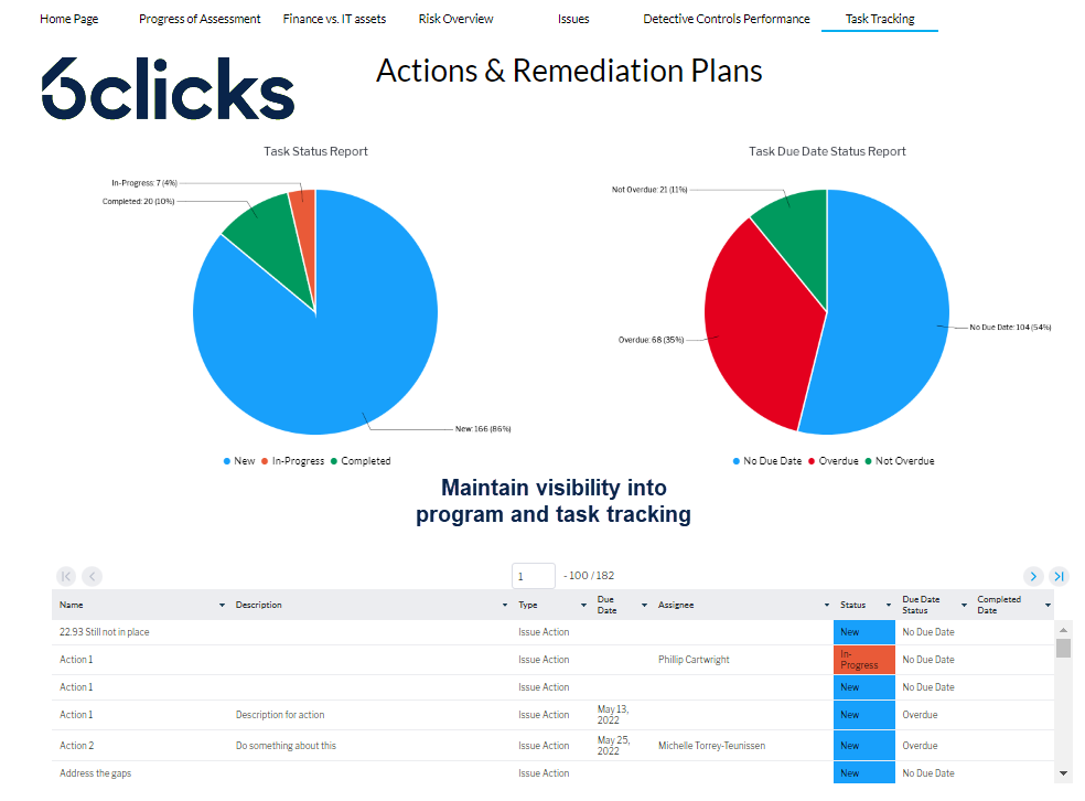 | تقرير سجل المهام | ملخص لمهام خطة معالجة المخاطر وإجراءات القضايا ومسؤوليات الضوابط |