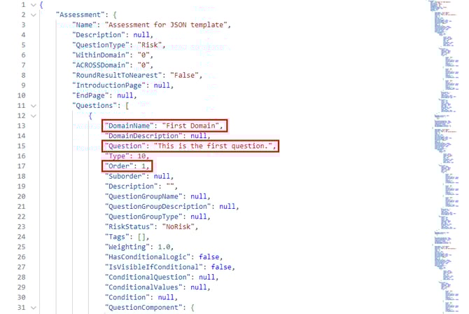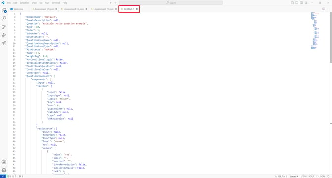 انسخ أو قص كل شيء يتعلق بالسؤال الفردي في ملف JSON. يجب أن يشمل ذلك أول قوس معقوف تحت Questions، والقوس المعقوف الختامي المقابل، وكل ما يتوسطهما.