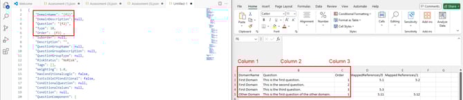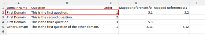 لربط ضابط أو حكم بسؤال في ملف CSV الخاص بك، أضف عمودًا بعنوان إما MappedPolicyControl للضوابط، أو MappedReferences للأحكام المتعلقة بالسلطة. مثل أي تقييم قائم على الأسئلة آخر، يمكن ربط إما الضوابط أو الأحكام، وليس كليهما.