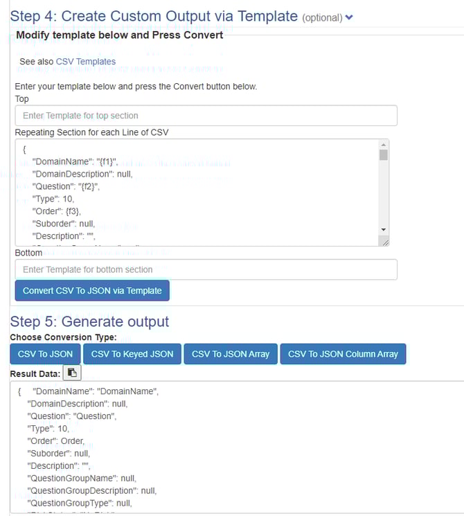 انقر على Convert CSV To JSON via Template أو الزر المخصص لذلك لإنتاج الناتج في الخطوة ٥. يجب أن يتضمن الناتج كل سؤال موجود في ملف CSV باستخدام التنسيق من ملف JSON الخاص بنا. إذا كان لديك الكثير من الأسئلة، قد يستغرق هذا بعض الوقت.