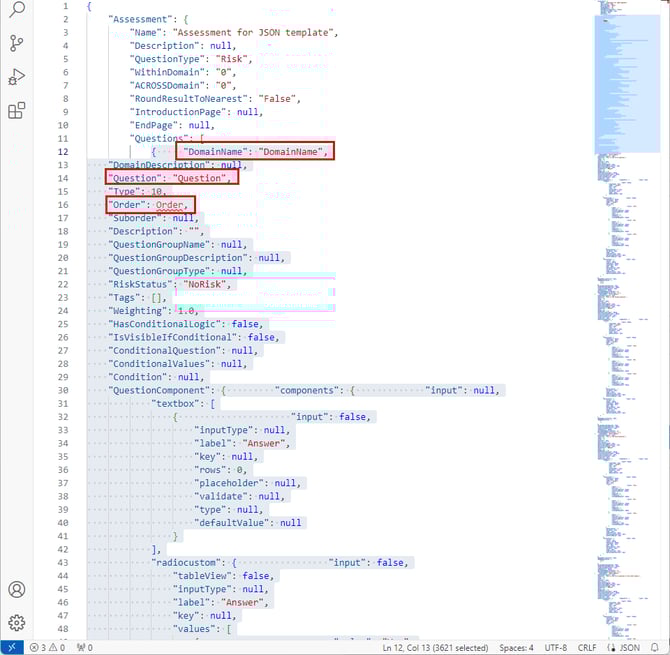 افتح ملف JSON في المحرر المفضل لديك، ويجب أن ترى جميع عناوين الأعمدة والبنية كما هو مطلوب لتقييمك.