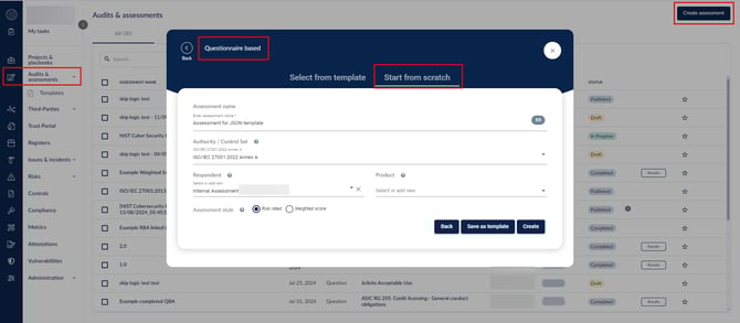 أنشئ تقييم قائم على الأسئلة (QBA) من الصفر واربط مجموعة السلطة أو الضوابط إن لزم الأمر. املأ المعلومات في هذه الشاشة بأكبر قدر ممكن من الدقة لتتماشى مع الشكل الذي تريد أن يتحول إليه التقييم في ملف CSV الخاص بك.