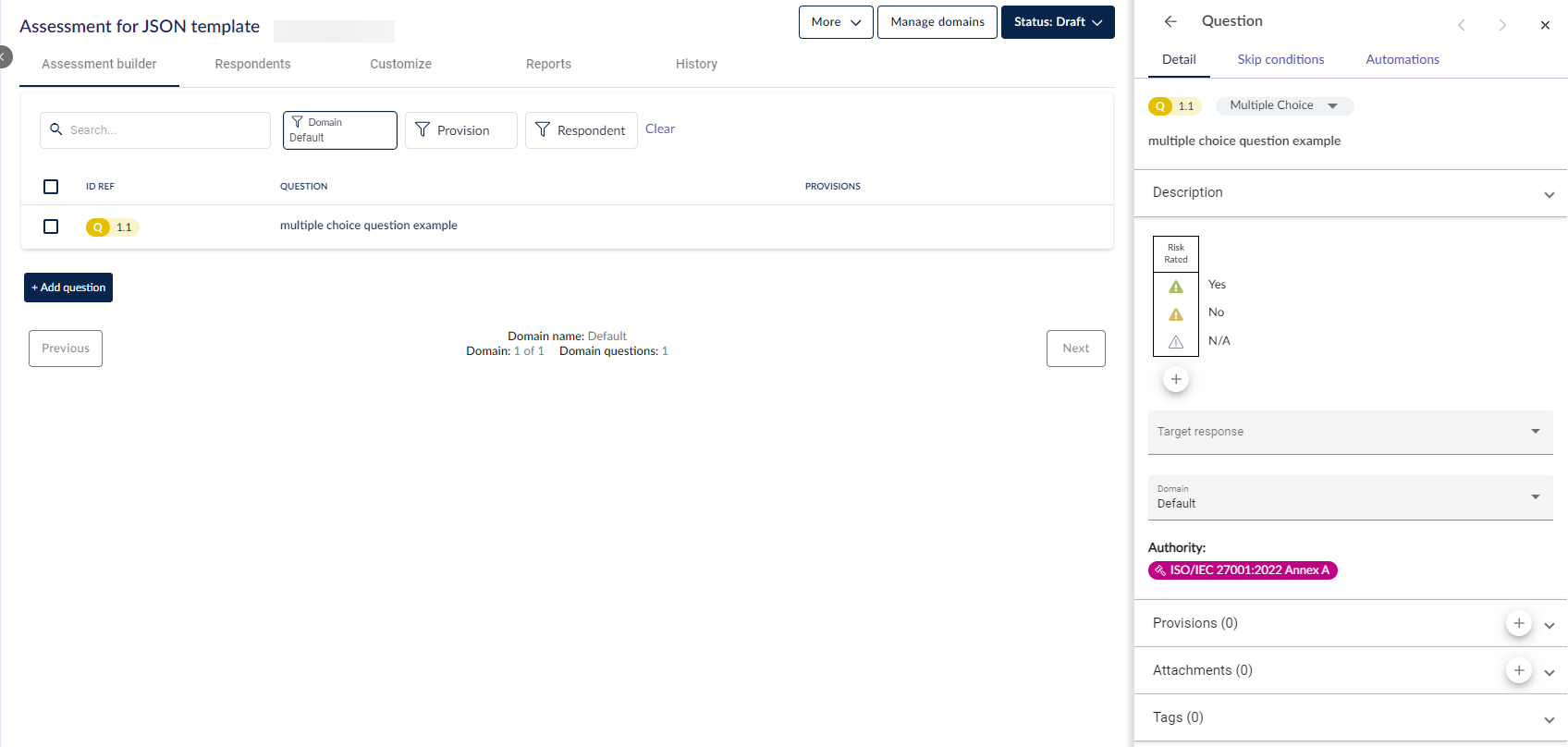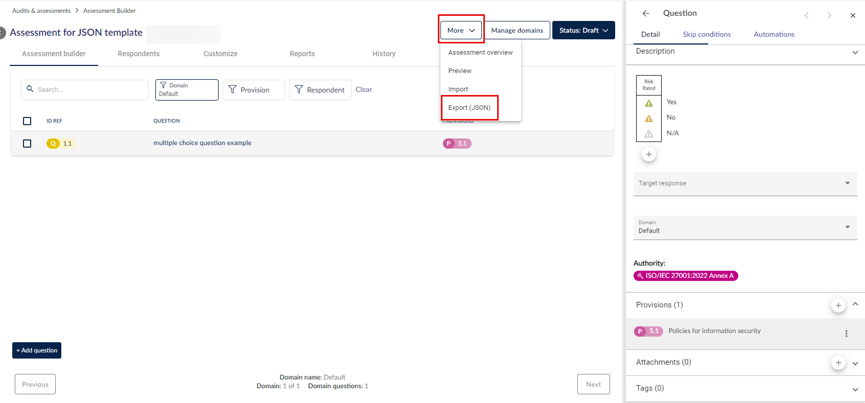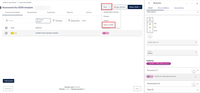 احفظ ملف الاستيراد النهائي وتوجه إلى Audits & assessments في 6clicks. أنشئ تقييمًا جديدًا أو استخدم تقييمك التجريبي بالنقر على More > Import، وبعد ذلك يمكنك حذف النطاق الافتراضي للتخلص من السؤال المفرد.