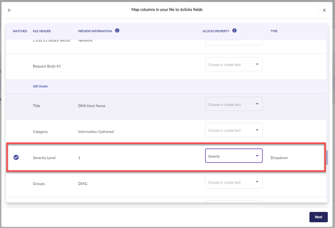 - معرّف المصدر (حقل 6clicks) يتم تخطيطه إلى QID (حقل ملف الاستيراد). عند تخطيط معرّف المصدر، يقوم النظام لدينا بالإشارة إلى معرّف المصدر لمقارنة وتحديث سجلات الثغرات للأصل المعني عند الاستيراد. إذا لم يتم التخطيط، يقوم النظام بالمقارنة والتحديث استناداً إلى العنوان.