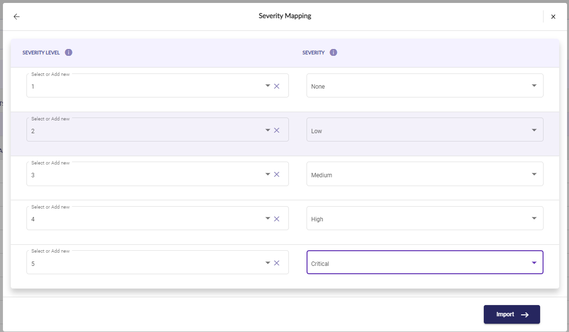 إذا قمت بتخطيط تقييمات الشدة، ستظهر لك شاشة تخطيط الشدة. هنا يمكنك تخطيط القيم في ملف الاستيراد إلى القيم الافتراضية لـ 6clicks. فيما يلي مثال يستخدم فيه ملف الاستيراد أرقام من 1 إلى 5 للدلالة على الشدة. أحياناً، قد لا يتضمن ملفك جميع قيم الشدة، لذا سيتعين عليك إنشاؤها في العمود الأيسر من الحقول. هذا مهم لعمليات استيراد الفحص المستقبلية التي تظهر فيها تقييمات الشدة.