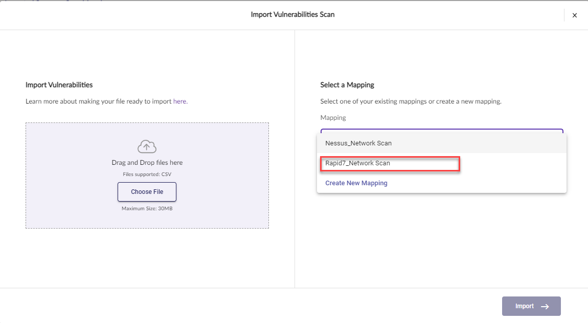 اختر تخطيط فحص موجود من القائمة، ثم اختر استيراد. في هذا المثال، نستخدم Rapid7_Network Scan.