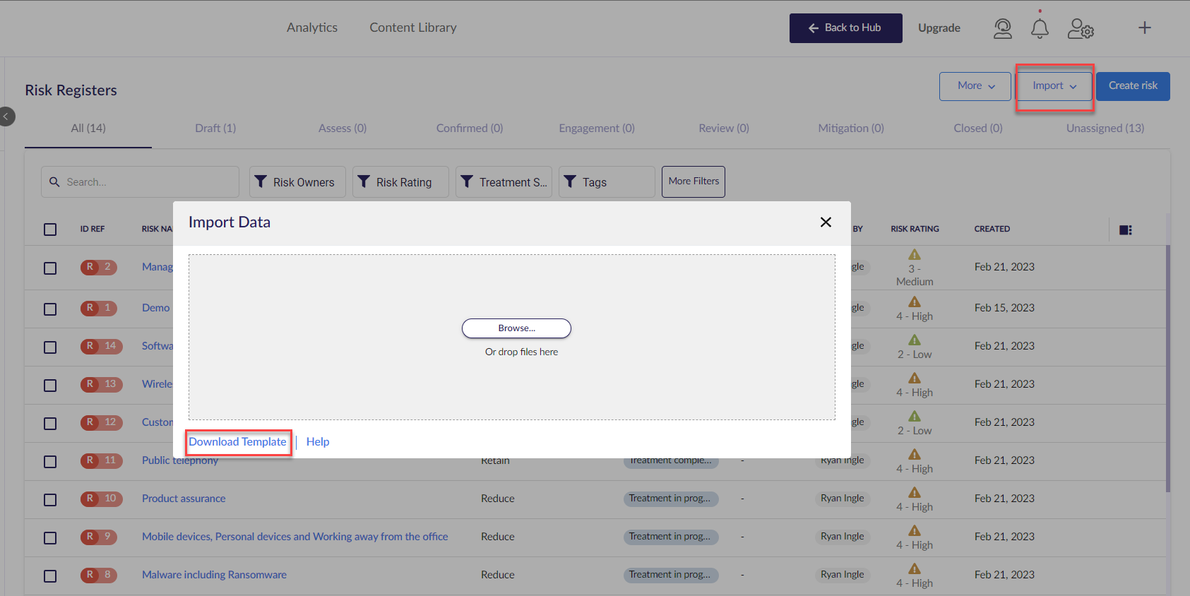 يمكنك استيراد المخاطر إلى سجلات المخاطر بحيث يمكنك بدء اتخاذ الإجراءات فوراً، مثل تقييمها أو تنفيذ خطط معالجة المخاطر. يمكنك أيضاً استيراد أو إضافة قوالب المخاطر إلى مكتبات المخاطر حتى تكون هذه المخاطر جاهزة للإضافة إلى السجلات عند الحاجة إلى معالجتها.