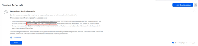 وأخيراً وليس آخراً، أدخل ٤) عنوان رمز الوصول (Token URL) والذي يمكن العثور عليه في حساب Wiz الخاص بك، تحت الإعدادات > إدارة الوصول > حسابات الخدمة.