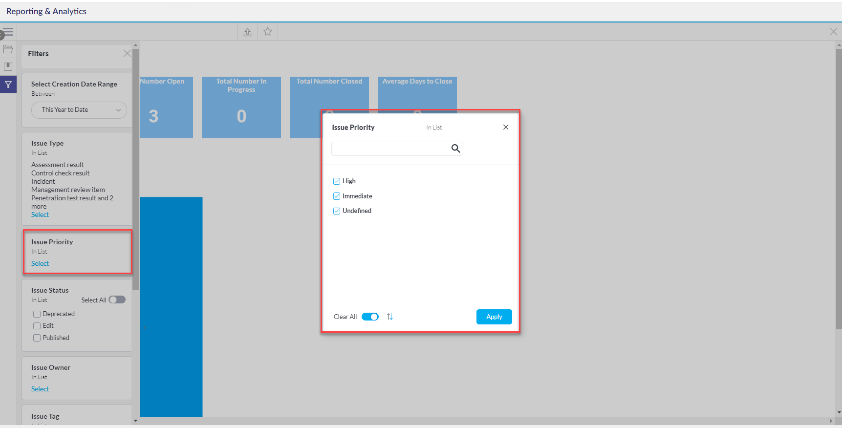 - أولوية المشكلة: اختر مستوى أولوية المشكلة من القائمة. حرك زر تحديد الكل لتحديد جميع الخيارات المتاحة. انقر على تطبيق لتنفيذ الاختيار.