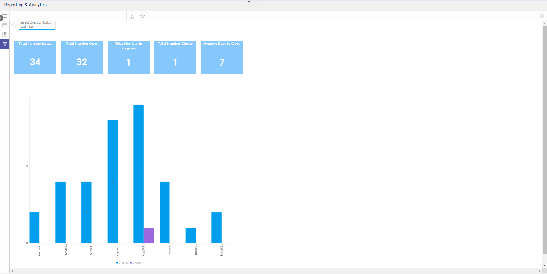 ستظهر نتائج تقرير التقييم. ستعرض النتائج في مخطط بياني شريطي، حيث يظهر عدد المشكلات على المحور الرأسي وتواريخ الإنشاء والإغلاق على المحور الأفقي.