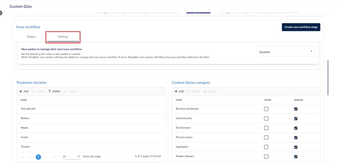 تتيح لك علامة التبويب الإعدادات اختيار ما إذا كانت Spokes الجديدة تتبع تدفق العمل الافتراضي للمشكلات، أو تحديد تدفق العمل الخاص بها.