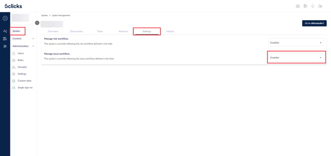 إذا لم يعد Spoke يرغب في إدارة تدفق عمله الخاص، يمكنه إعادة ضبطه بحيث يعود إلى إعدادات Hub. عند تغيير إعداد إدارة تدفق العمل للمشكلات إلى معطّل لذلك Spoke، ستبدأ 6clicks في تنفيذ عملية التحويل.