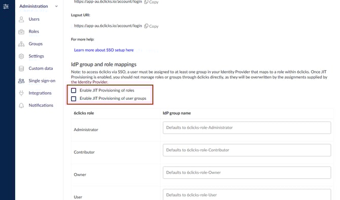 بمجرد تمكين التزويد الفوري عند الحاجة، يجب عدم إدارة الأدوار أو المجموعات مباشرة عبر 6clicks، حيث سيتم الكتابة فوقها بواسطة التعيينات المقدمة من موفر الهوية.