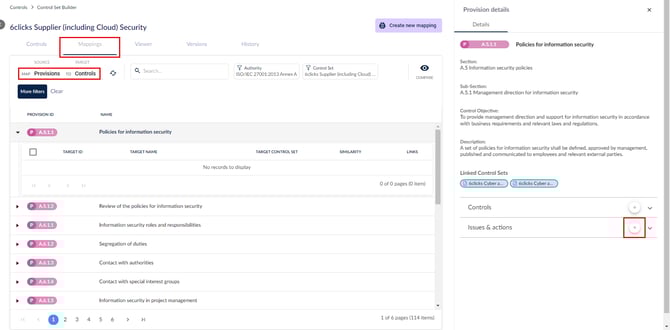 تأكد من أنك في تبويب Mappings ضمن مجموعة الضوابط بوضع Edit، وأنك تقوم بربط Provisions (المصدر) مع Controls (الهدف). يمكنك استخدام مرشح Authority للأحكام التي تحتاج إلى العمل عليها.