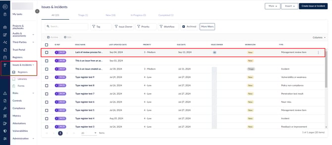 انتقل إلى Issues & Incidents > Registers، وانقر على المشكلة التي قمت بربطها أو إنشائها مقابل حكم معين.