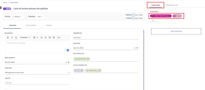 في علامة التبويب Overview الخاصة بالمشكلة، يمكنك العثور على ارتباط الحكم في اللوحة الجانبية ضمن تبويب Linked data.
