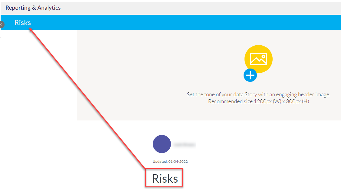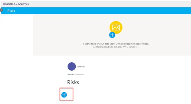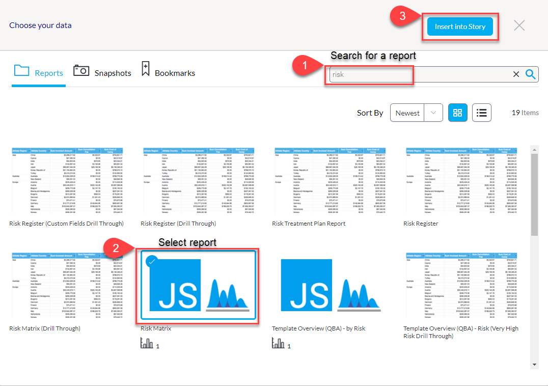 ثم ابحث عن التقرير الذي ترغب في إضافته إلى قصتك مثل Risk Matrix. اختر التقرير المطلوب واضغط على إدراج في القصة.