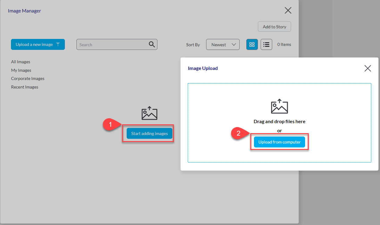 . انقر على البدء في إضافة الصور ثم يمكنك سحب وإفلات الصورة أو الضغط على التحميل من الحاسوب واختيار الصورة التي تريد تحميلها.