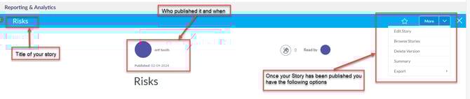بمجرد أن تكون راضياً عن قصتك وقد نقرت على نشر، ستحصل على نظرة عامة على قصتك مع جميع التفاصيل مثل عنوان قصتك، والشخص الذي نشرها، وتاريخ النشر، والمزيد ضمن خيار المزيد.