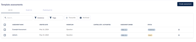 بمجرد إنشاء التقييم سيكون في حالة منشور، ولا يمكن تغيير الحالة إلى تعديل. سيتم قفل أي بيانات مرتبطة بالقالب، على سبيل المثال إذا كان هناك مجموعة ضوابط مرتبطة بالقالب المقفل، فسيتم قفل مجموعة الضوابط أيضًا.