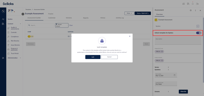 يمكن للشركاء أو المؤسسات التي لديها Hubs قفل قوالب التقييم للتعديل قبل نشرها في مكتبة المحتوى الحصرية الخاصة بهم. إذا تمت إضافة قالب مقفل إلى Spoke، فلن يتمكن الـ Spoke من تعديله أثناء الاستخدام. هذا يسمح بمزيد من التحكم المركزي على التقييمات.