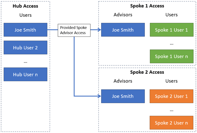 في هذا المثال، تم منح Joe Smith وصول Advisor إلى كلا Spokes. بينما لدى باقي المستخدمين صلاحية الوصول فقط إلى الـ tenants (Hub أو Spoke) التي تم تعيينهم إليها.