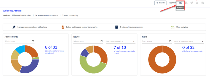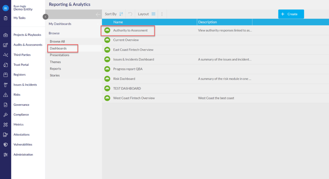 للوصول إلى تقرير "السلطة إلى التقييم"، انتقل إلى Analytics بالنقر على أيقونته في أعلى يمين أي شاشة من 6clicks وابحث عن لوحات المعلومات أو ابحث عن "السلطة إلى التقييم".