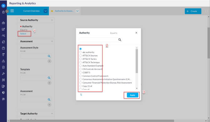 يحدد مرشح قالب التقييم أي قوالب تقييم تعمل ضد هذه السلطة التي سيتم تضمينها في التقرير. انقر على أيقونة البحث للبحث عن القوالب (١). اختر قالبًا يعمل ضد هذه السلطة (٢). انقر على تطبيق بمجرد إتمام اختيارك (٣).