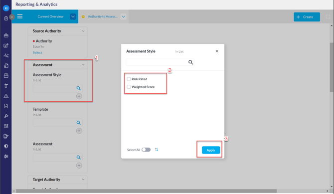 يحدد مرشح نمط التقييم نمط التقييم الذي ترغب في مراجعته. انقر على أيقونة البحث تحت قسم نمط التقييم (١). اختر "مصنف حسب المخاطر" أو "الدرجة الموزونة" (٢). انقر على تطبيق لتطبيق هذه الأنماط على المرشح الخاص بك (٣). عند النقر على أيقونة البحث (العدسة المكبرة)، ستظهر فقط أنماط التقييم المتاحة لهذه السلطة في بيئتك.