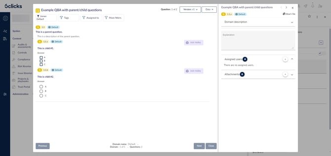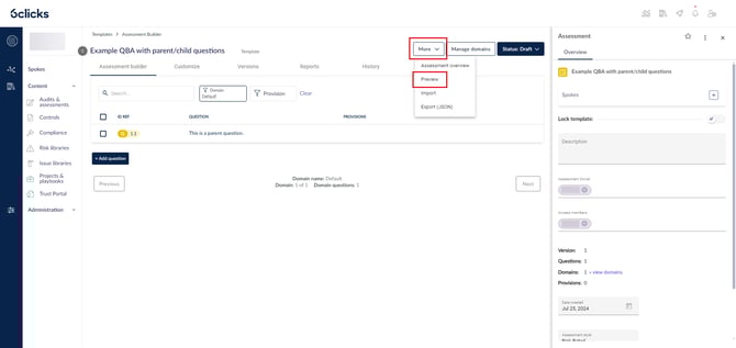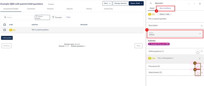 من خلال النقر على السؤال الرئيسي، يمكنك تنفيذ إجراءات عليه كالسؤال العادي، مثل تغيير النطاق الذي ينتمي إليه (1)، وإضافة شروط التجاوز (2)، وربط الأحكام/الضوابط في حال كان هناك مجموعة سلطات/ضوابط مرتبطة بالتقييم القائم على الأسئلة (3)، وإرفاق المستندات (4).