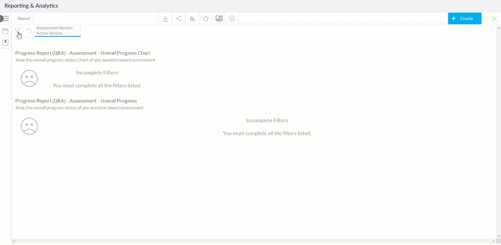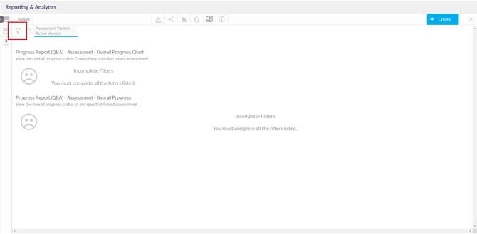 اختر الفلاتر المناسبة لعرض تقييمات التقييم القائم على الأسئلة المختلفة وتوليد تقرير. ليست كل خيارات الفلاتر إلزامية؛ سيتم تمييز الخيارات الإلزامية بنقطة حمراء.