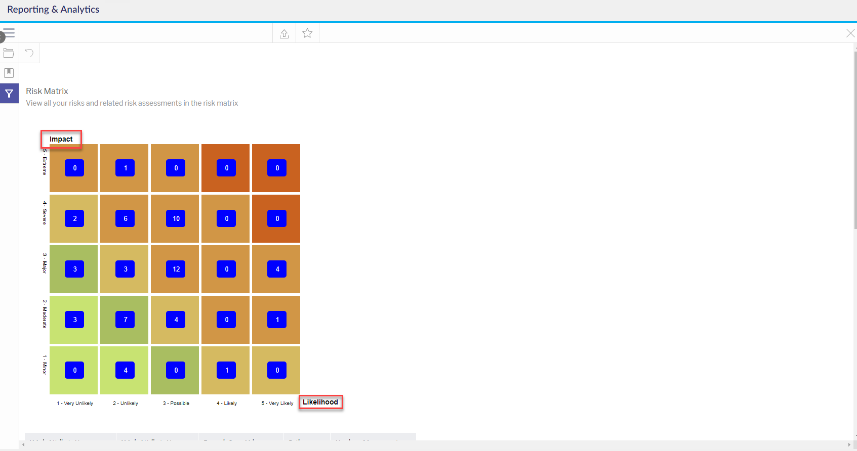 انتقل إلى علامة التبويب التحليلات باستخدام قائمة التنقل في أعلى اليمين. انقر هنا للحصول على نظرة عامة على وحدة التقارير والتحليلات. انقر هنا للحصول على نظرة عامة على وحدة المخاطر في 6clicks.