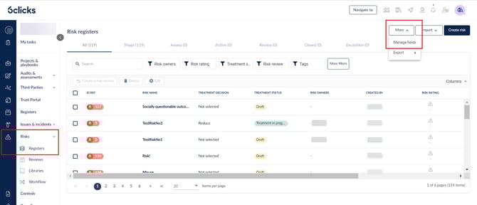 انتقل إلى Risks > Registers ثم انقر على More > Manage fields.