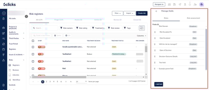 سترى جميع حقول المخاطر المخصصة في لوحة الجانب Manage fields.