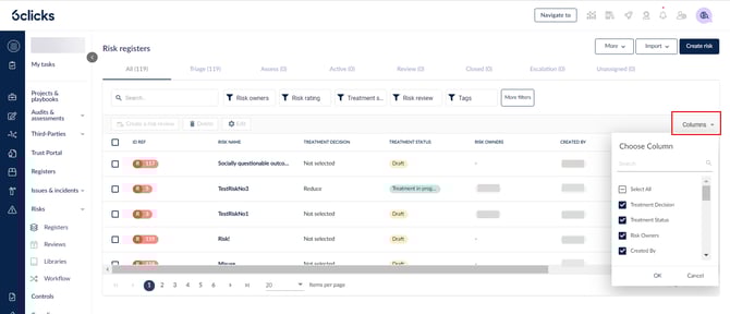 إدارة الأعمدة في عرض سجل المخاطر