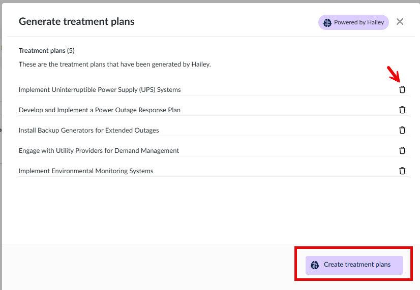ستظهر لك نافذة حوار مشابهة لما يلي تحتوي على قائمة بخطط معالجة المخاطر المحتملة لهذا الخطر المحدد. إذا لم ترغب في إضافة خطر معين، يمكنك حذفه في هذه المرحلة (أو لاحقًا، إذا رغبت). إذا كنت راضيًا عن القائمة المعروضة، فانقر على إنشاء خطط المعالجة. سيتم إنشاء خطط المعالجة وربطها بالخطر الذي تم توليدها فيه.