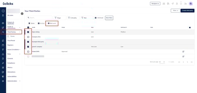 انتقل إلى وحدة الأطراف الخارجية (أو أي كان الاسم الذي قمت بتسميته) وحدد الأطراف الخارجية التي ترغب في إرسال التقييمات إليها بالجملة عن طريق النقر على مربعات الاختيار بجانبها.