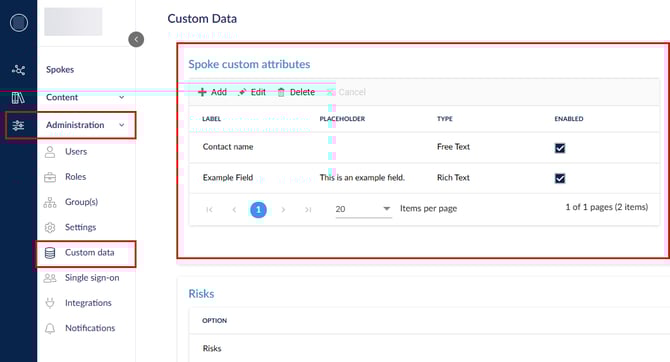 للحصول على تعليمات خطوة بخطوة لإنشاء حقول مخصصة، راجع هذا المقال المقارن المتعلق بالأطراف الثالثة بمجرد الدخول إلى Administration > Custom data > Spoke custom attributes.