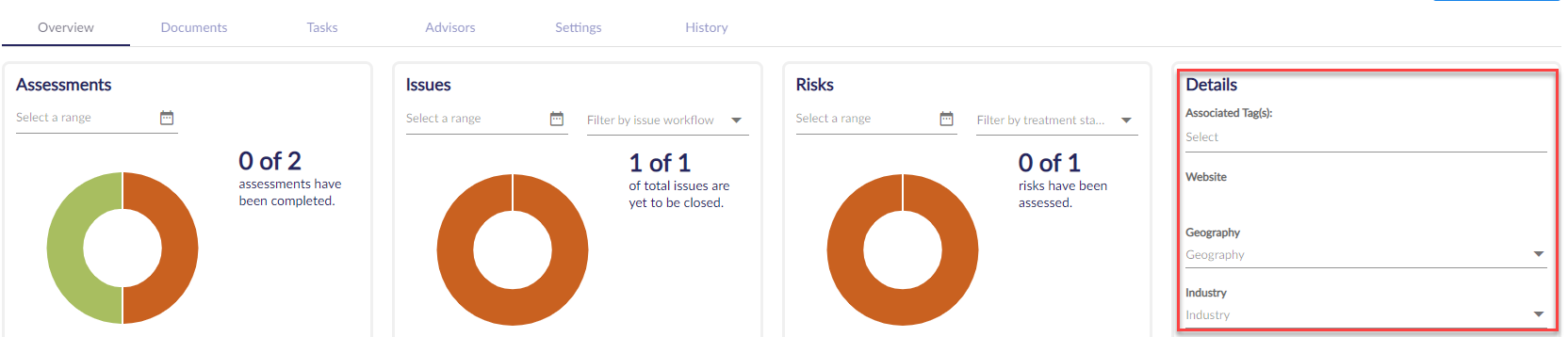 نظرة عامة، المستندات، المهام، المستشارون، السجل الزمني
