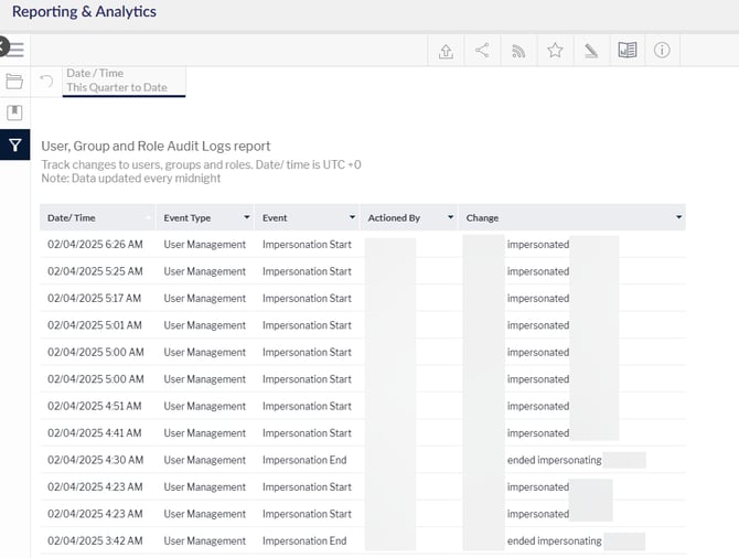 يمكنك مراقبة جميع أحداث تسجيل الدخول إلى مستأجرك، بما في ذلك أحداث تسجيل الدخول منا، باستخدام التقرير بعنوان "تقرير سجلات التدقيق للمستخدمين والمجموعات والأدوار" في وحدة التحليلات.