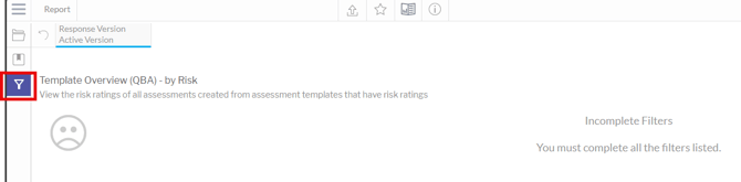 ستظهر خيارات التصفية. اختر المرشحات المناسبة لعرض مختلف تقييمات التقييم القائم على الأسئلة، ثم قم بتطبيق اختياراتك لإنشاء التقرير. ليست كل خيارات التصفية إلزامية؛ حيث سيظهر نقطة حمراء للدلالة على الخيار الإلزامي.