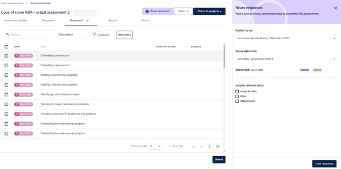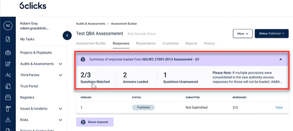 The Reuse Response function will attempt to populate the new assessment with the previous responses based on the completed mapping between the provisions. With the reused responses, the relevant fields can be selected and edited. These fields include: