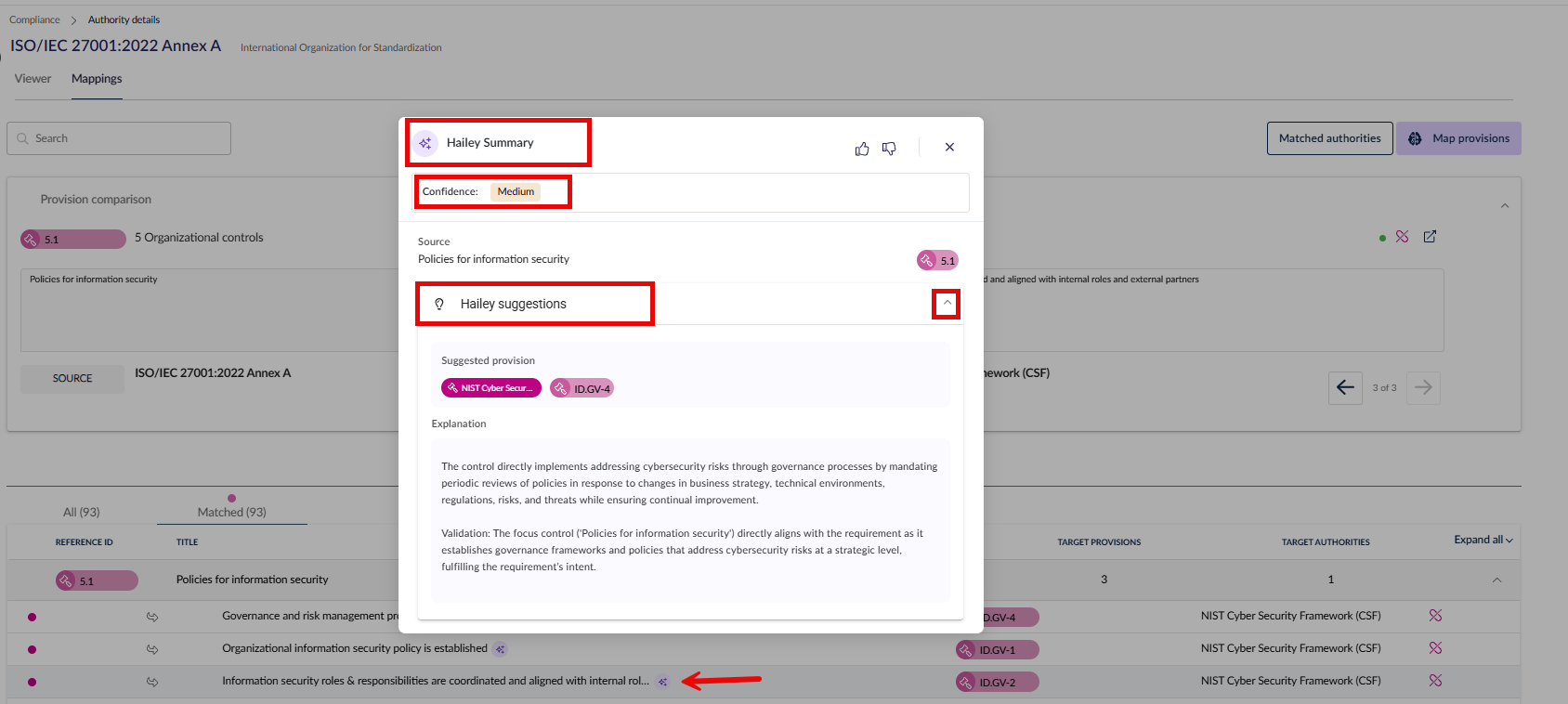 - Click on the View Hailey summary icon next to each matched provision to review more detailed information about the match.