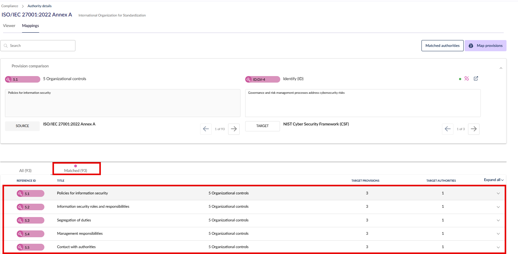 In this example, where we are mapping ISO/IEC 27001:2022 Annex A (or Source Authority) to NIST Cyber Security Framework (our Target Authority) you can see that 93 Source Provisions are Matched to Target Provisions.
