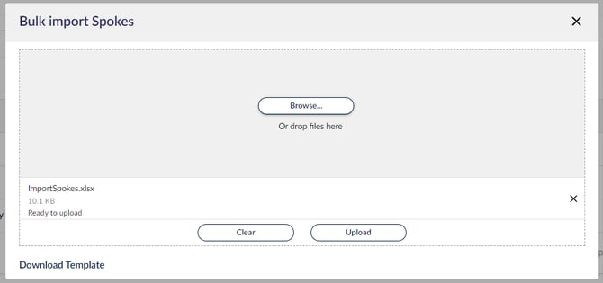 Once you have finished creating the template, click Browse in the Import Data modal to identify your file and then click Upload to import your new spokes.