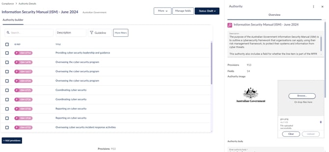 Click on a provision within an authority document to see more details in the side panel, such as all of this authority document's custom fields and related information.