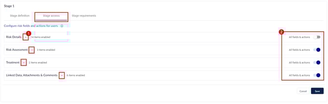 Use the arrows (1) to expand each section and turn off any actions you don't want the user to be performing for a risk in this stage. Use the sliders for the sections (2) if you want to allow or disallow every action in the section.