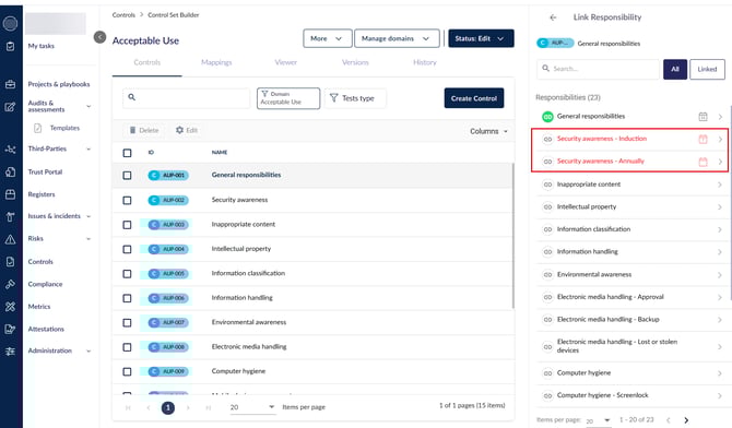 Similarly, consider linking responsibilities to controls if these controls can pass/fail.