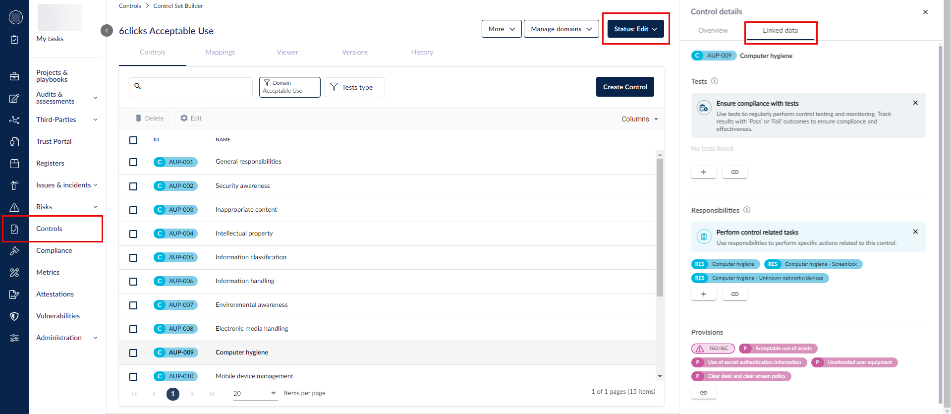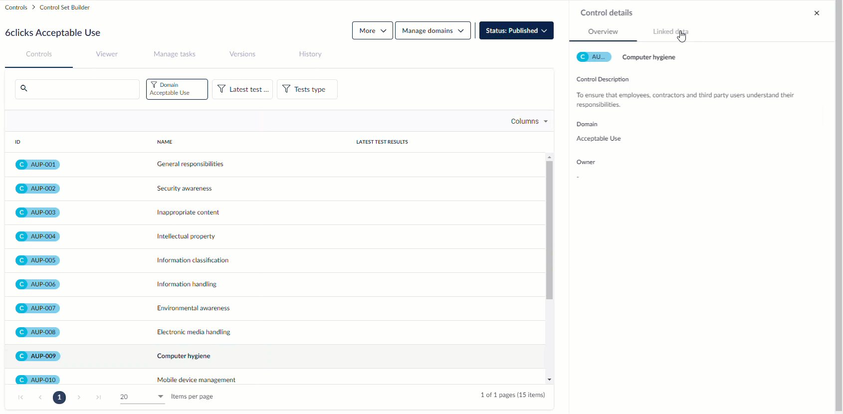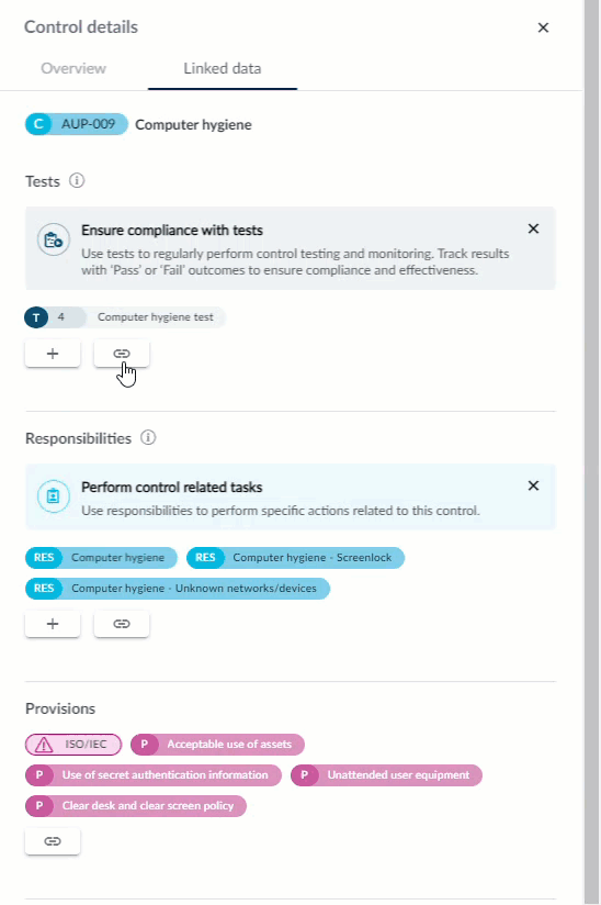 Now, you can still view the control details in the Overview tab in the side panel, but in the Linked data tab, you can click on the icons for Tests, Responsibilities and Provisions to expand them.