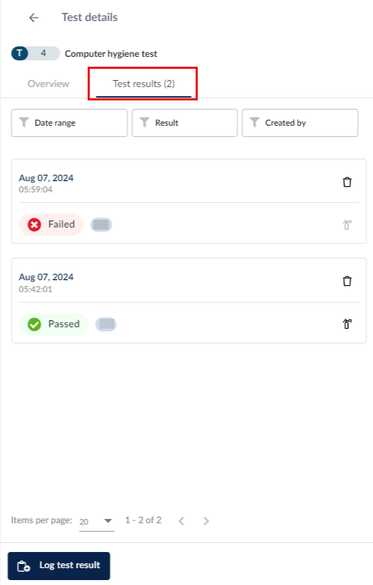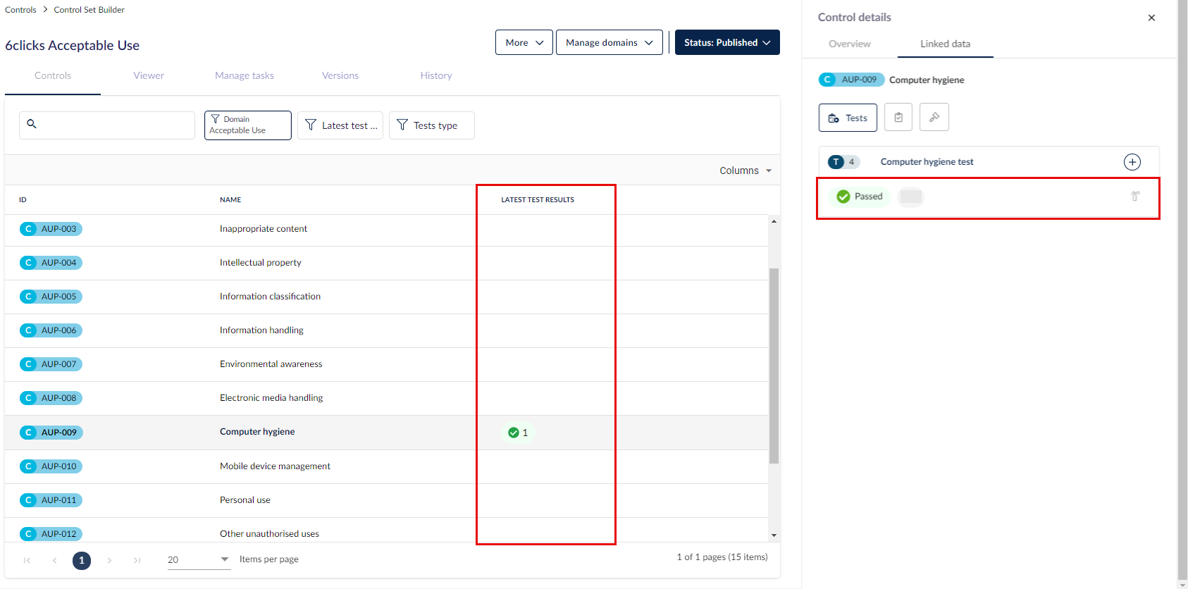 Add as many results to a test as necessary, and the Latest test results column in the controls table will be updated accordingly.